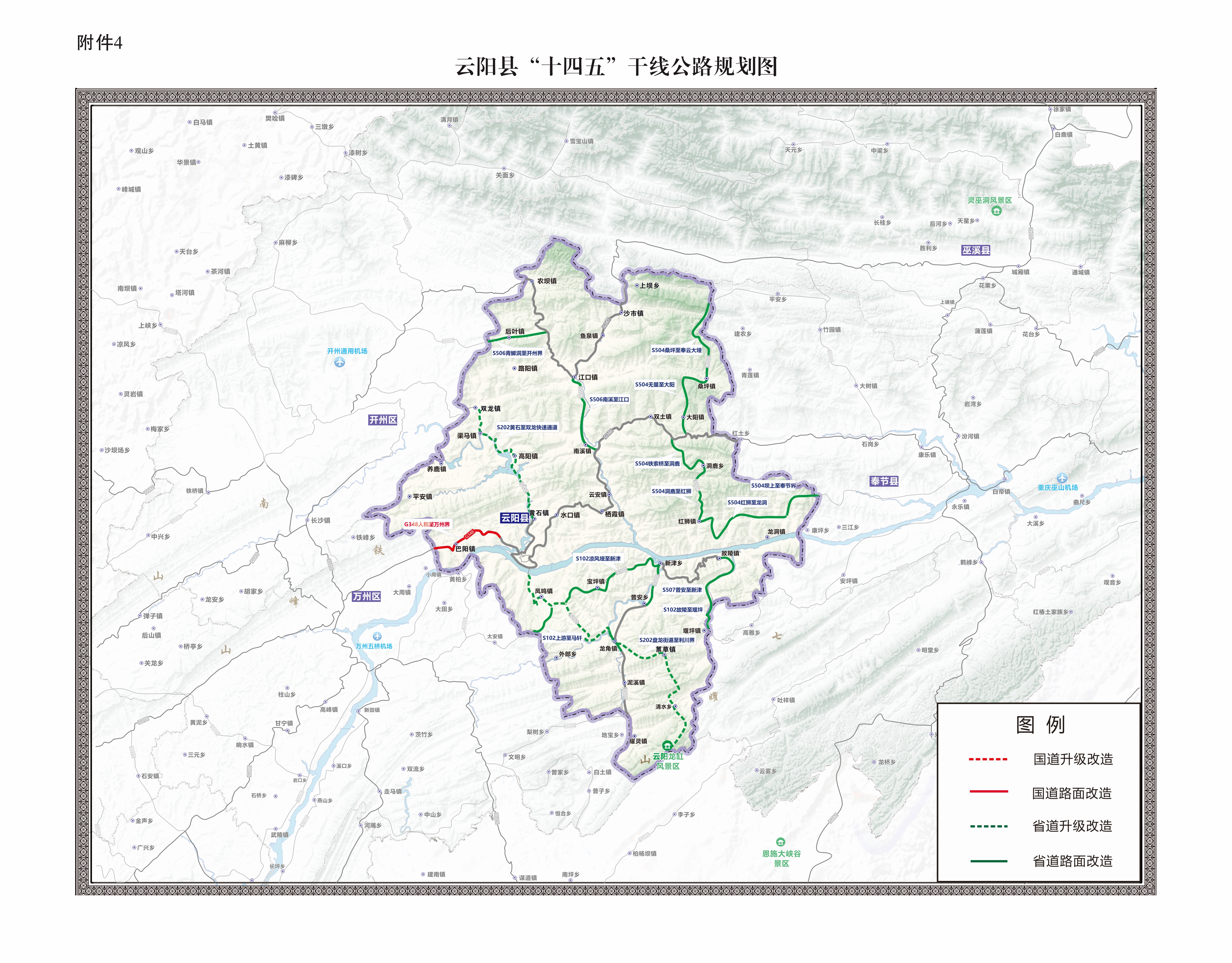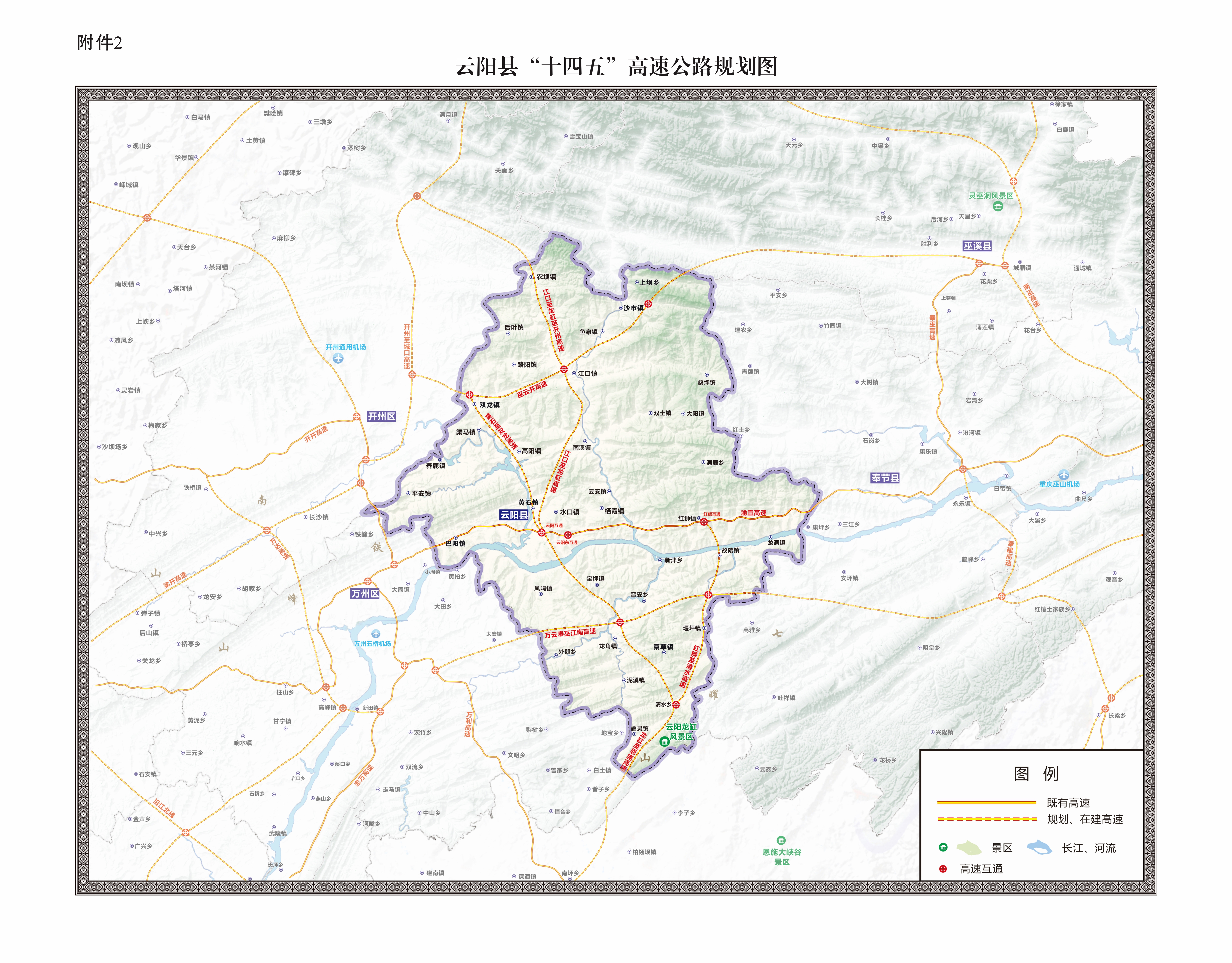 对外运输通道实现跨越式发展。规划实施后,形成北上甘陕、南下湘鄂、西进渝蓉、东出鄂沪交通大格局,全方位、高标准对接“一区两群”“三峡城市核心区”和“万达开统筹示范区”,紧密联系川、陕、鄂、湘等周边省份,深度融入成渝地区双城经济圈、“一带一路”和长江经济带等国家战略,对内加快实现“半小时高速、1小时云阳”,对外加快实现“半小时万州、开州,2小时重庆,3小时成都、武汉,6小时北京、上海、广州”目标。