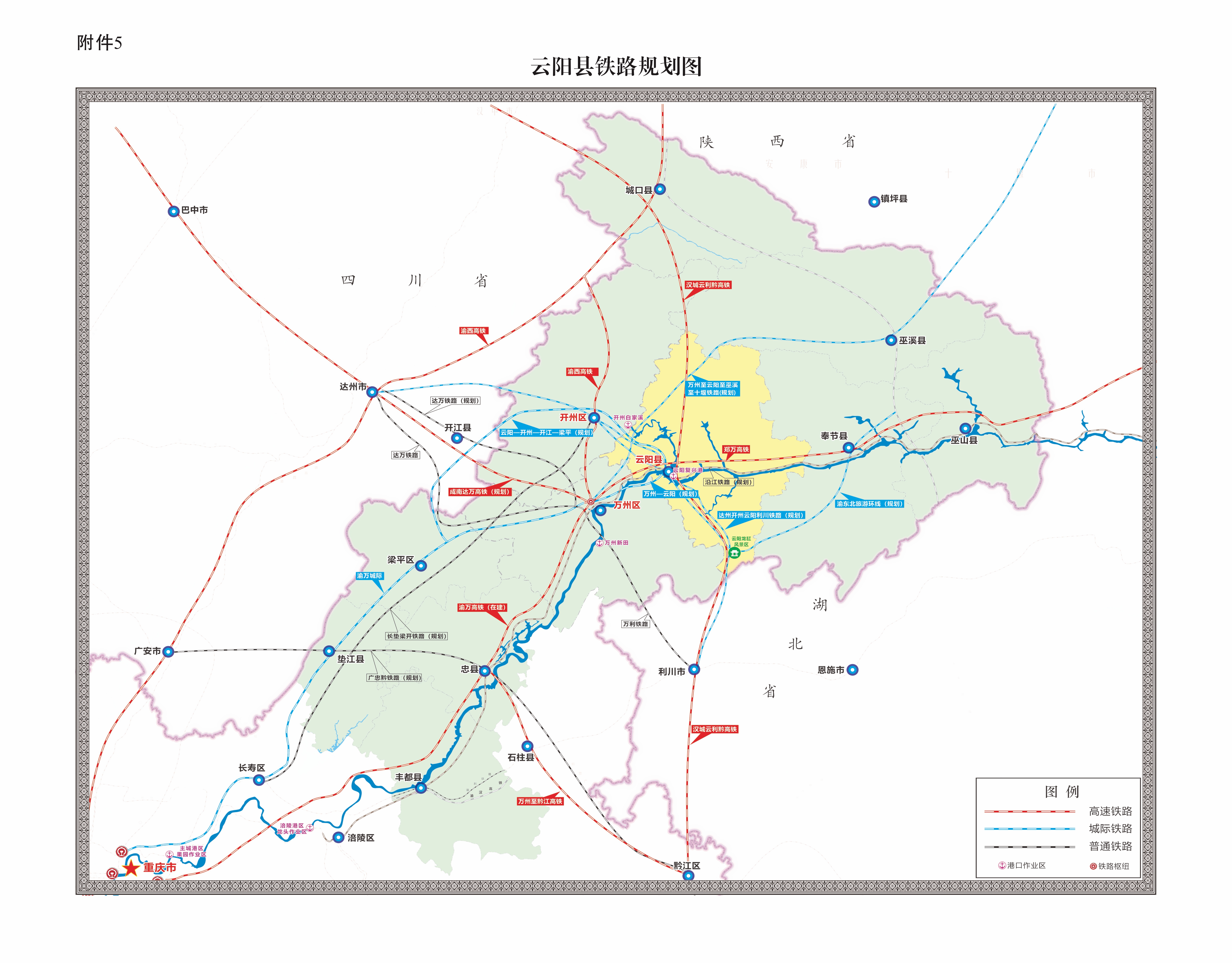 “两高两普一货四环”铁路网:两高是郑万高铁云阳段、汉中至城口至云阳至利川至黔江高铁;两普是达州至开州至云阳至利川、万州至云阳至巫溪至十堰普速铁路;一货是沿江货运铁路;四环是万达开云环线城际铁路、县城外环有轨电车、龙缸至堰坪至故陵至新津至普安至龙角至泥溪至耀灵至龙缸观光轨道环线、渝东北旅游环线。